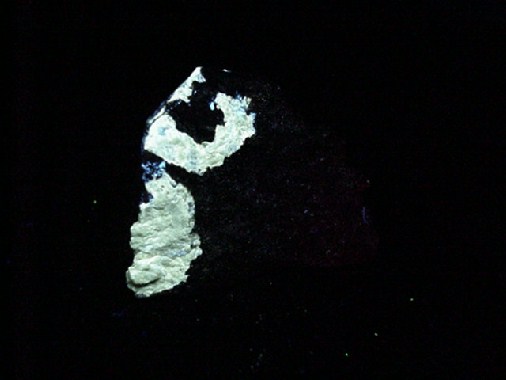 Powellite fluoresces light yellow while spots of scheelite fluoresces